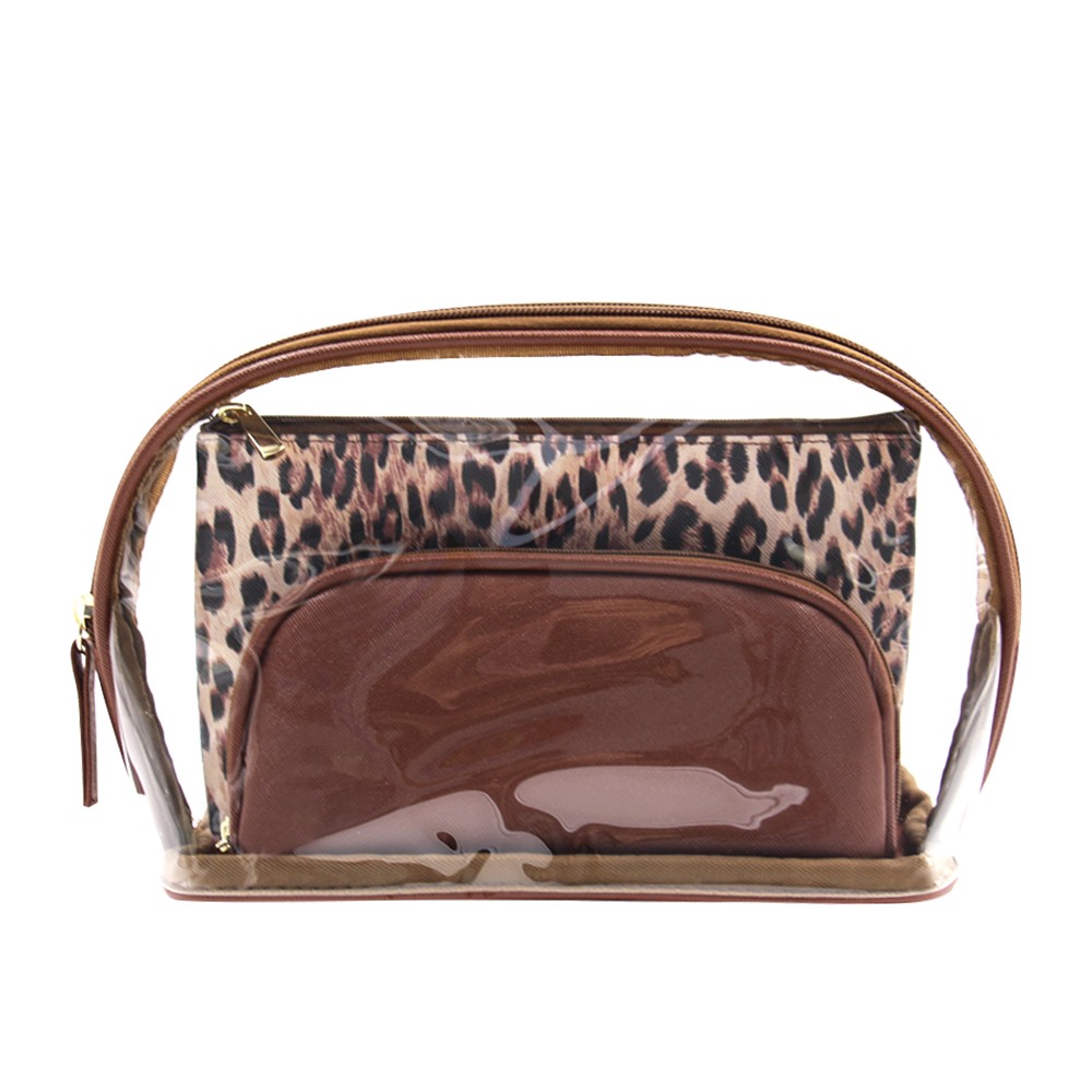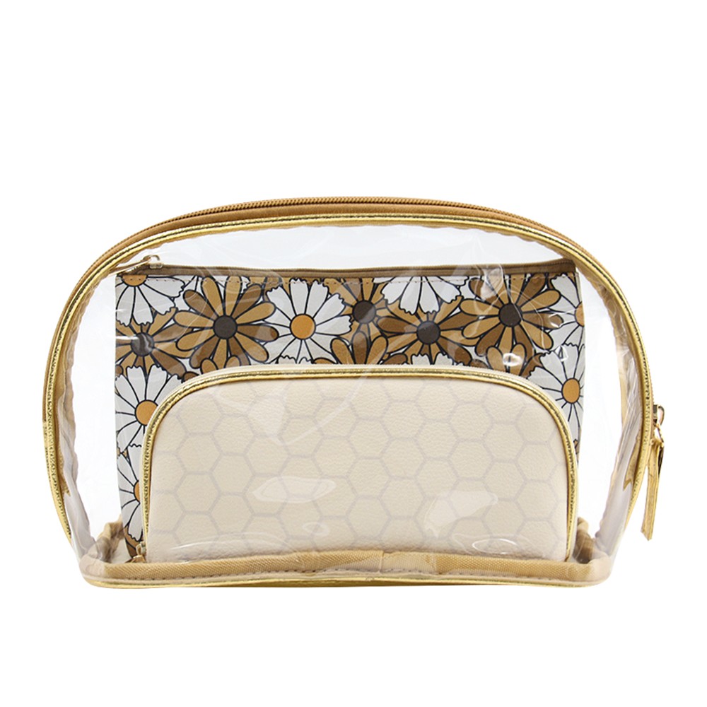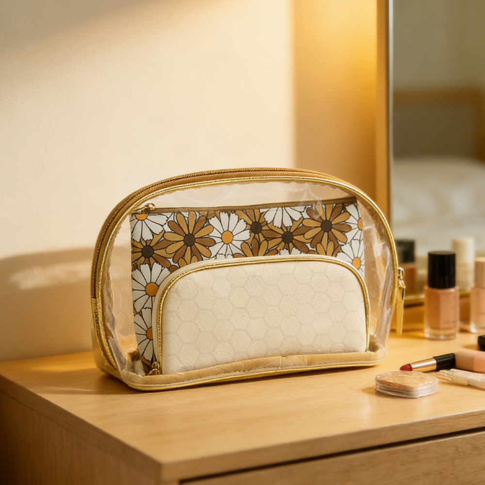CBS02-A001 is a playful yet practical 3-piece travel organizer set designed to keep beauty essentials neatly separated and easy to find. The transparent PVC outer bag offers clear visibility and a stand-up shape for countertop use, while the two inner pouches help you sort items by purpose—daily makeup, skincare minis, brushes, or small accessories.