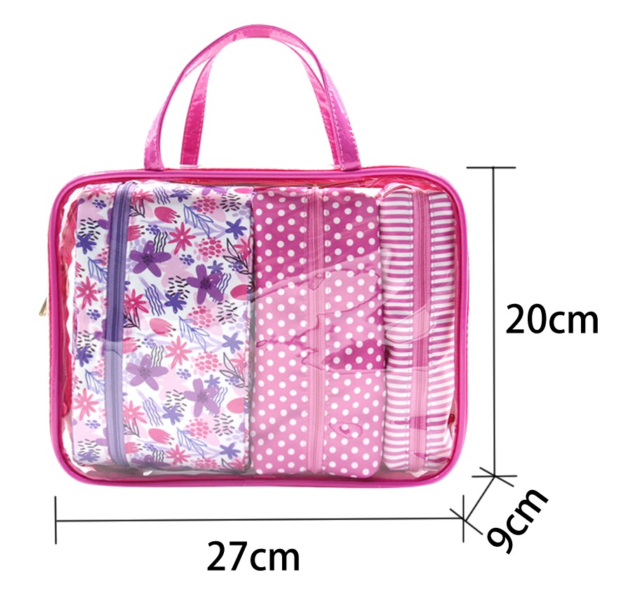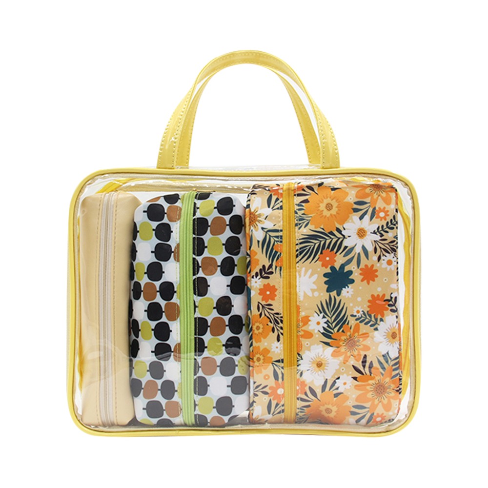 • Set includes: 1 clear carry bag + 3 inner zip pouches (assorted prints)