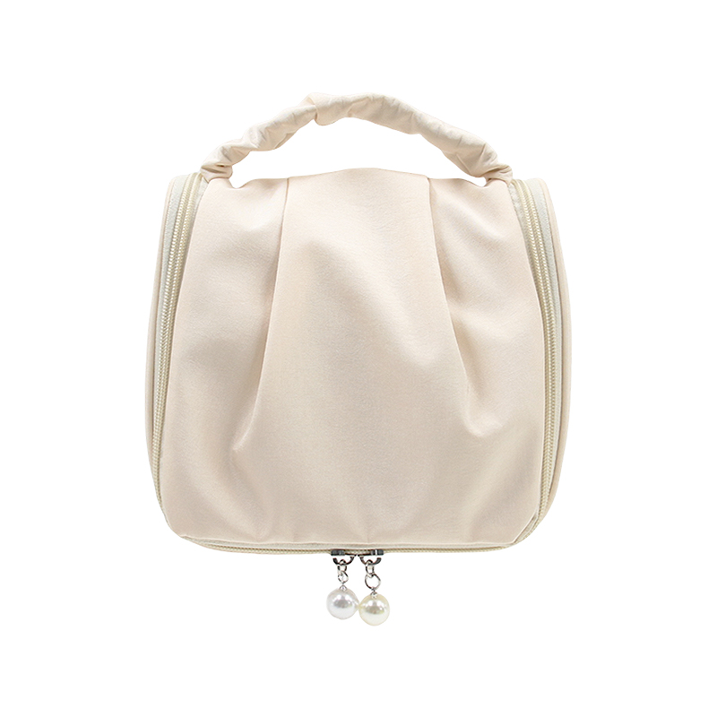 Elegant, soft, and made for everyday organization—this vanity-style makeup bag combines a structured profile with a refined pleated front for a modern, elevated look. The boxy shape keeps items upright and easy to find, while the wide zipper opening gives quick access to essentials whether you’re getting ready at home or packing for a trip. Finished with a padded top handle and pearl charm hardware, it brings a polished touch to functional storage—ideal for beauty routines, weekend travel, or keeping your daily must-haves neatly in one place.