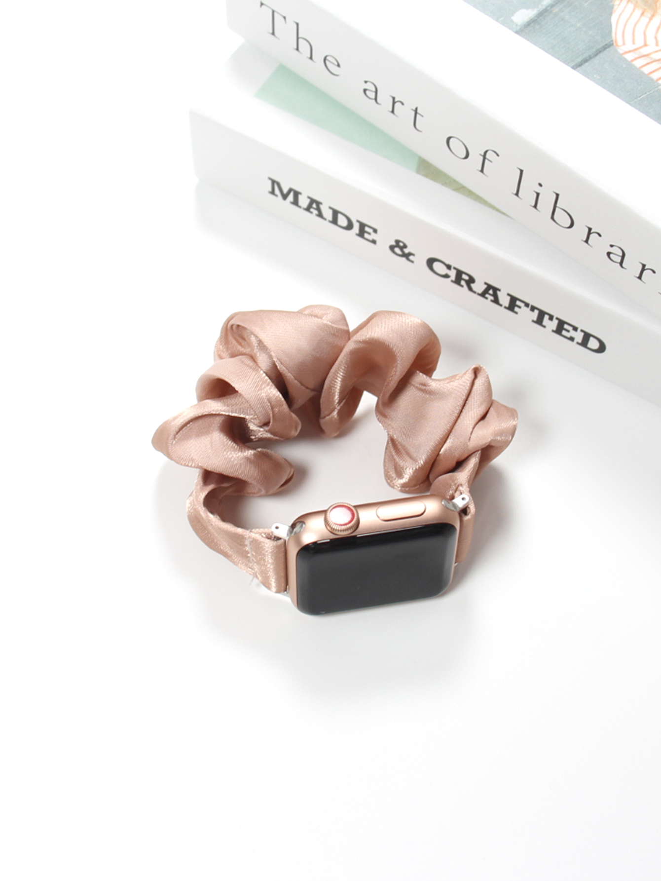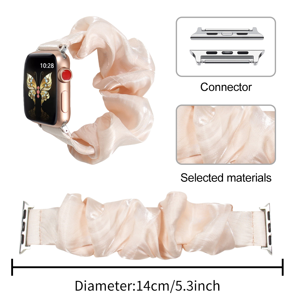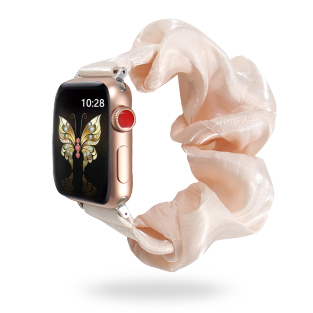 Designed with a soft, feminine aesthetic, this satin scrunchie watch band offers a stylish and comfortable alternative to traditional watch straps. The ruched satin fabric creates a textured, voluminous look that feels lightweight yet durable, while the elasticated inner band ensures a snug, flexible fit on your wrist. The smooth, shiny satin surface gives it a luxurious, easy-to-clean finish, and the silver-tone metal connectors provide a secure attachment to your Apple Watch. Finished with a playful scrunchie design, it adds a soft, elegant touch to an otherwise modern, functional accessory—perfect for everyday wear, special occasions, or travel.