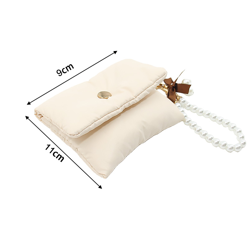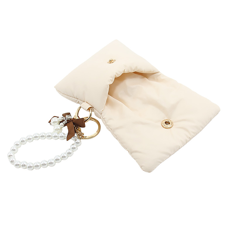 Cute, compact, and easy to carry, this puffy snap key pouch is designed for everyday essentials in a soft, padded silhouette. The lightweight nylon body provides a cushioned feel while helping protect small items inside. Finished with a secure snap-button flap, it keeps coins, cards, keys, or earbuds neatly stored and easy to access on the go. A side metal clasp plus pearl-bead wrist strap adds a charming, elevated detail—perfect for clipping onto handbags or carrying solo for quick errands.