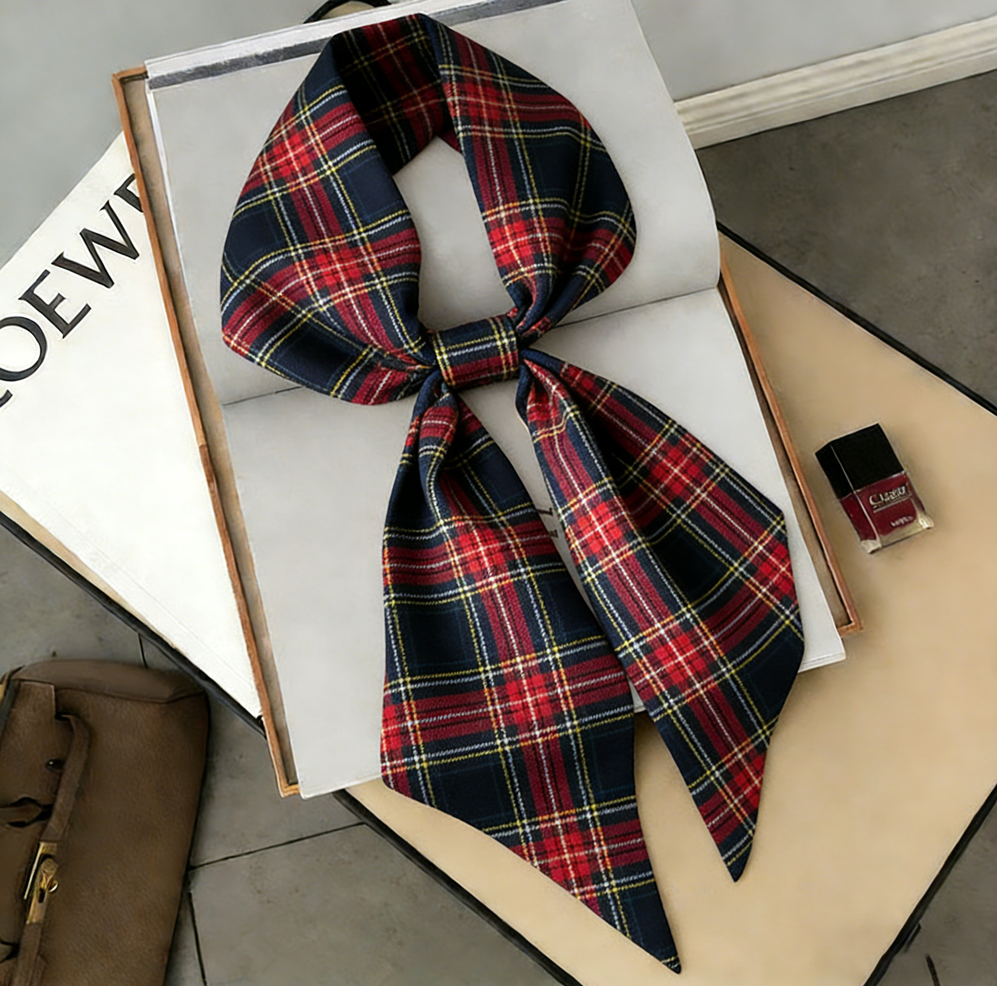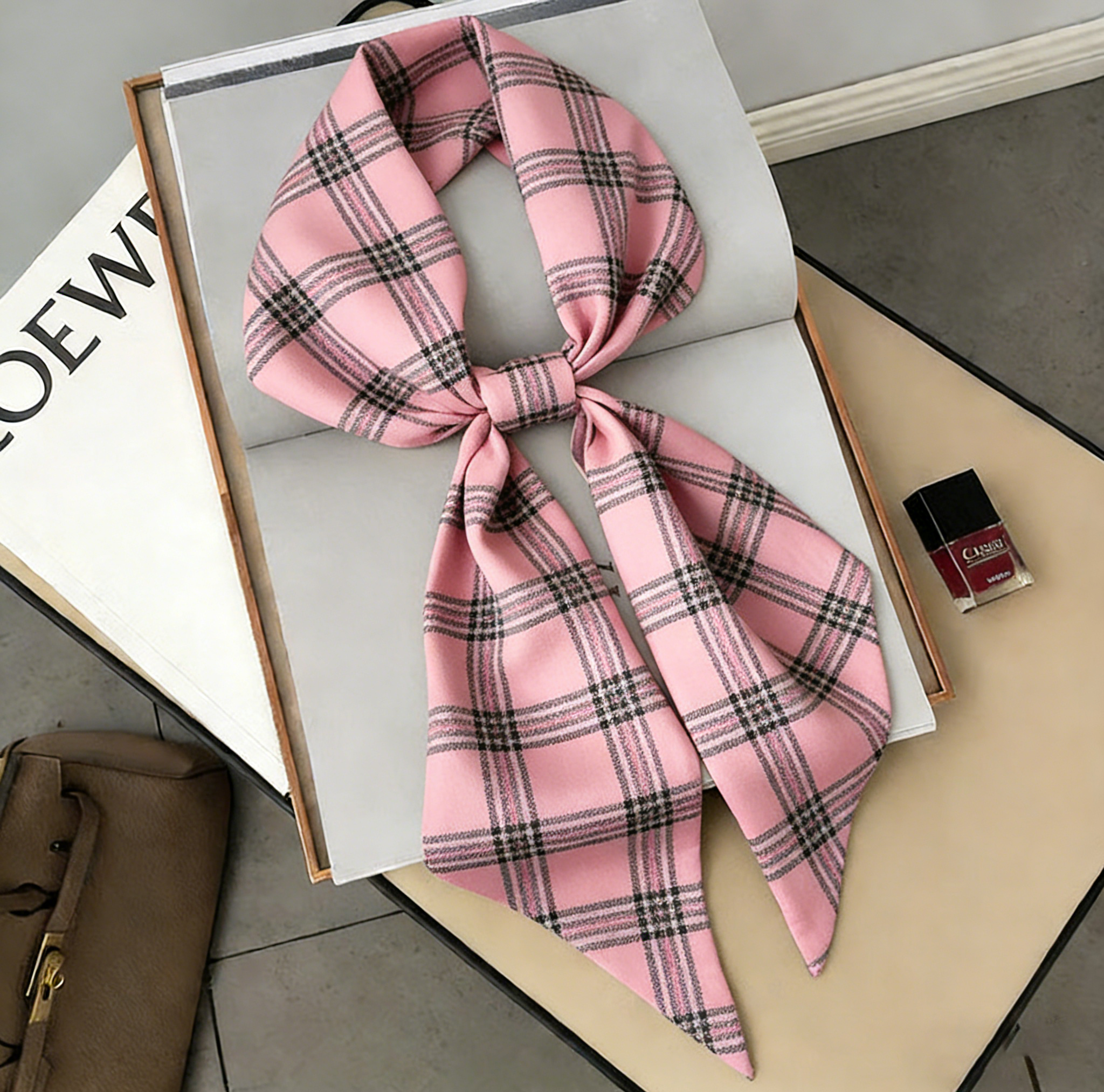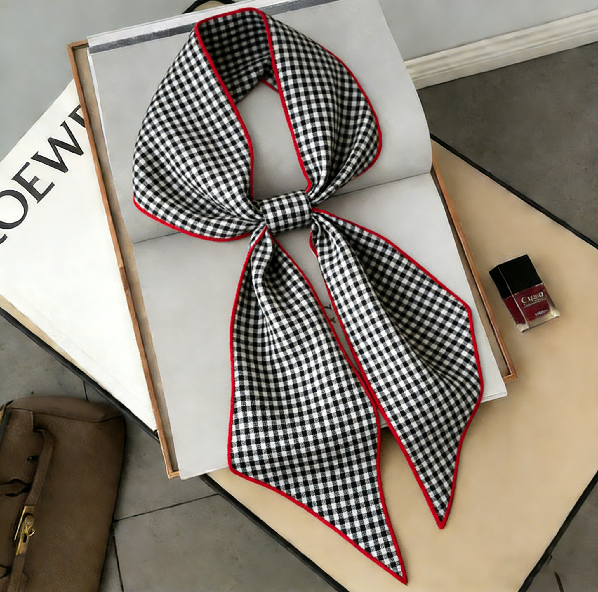 Classic with a playful twist, this gingham skinny scarf features a timeless black-and-white check print framed by bold red contrast edges for a clean, eye-catching finish. The lightweight, silky fabric ties easily into bows and knots without feeling bulky, making it perfect for styling hair, decorating handbags, or adding a chic accent to everyday outfits. Finished with neat edge stitching, it holds its shape beautifully—ideal for quick styling upgrades, gifting, or creating a polished “French-girl” look in seconds.