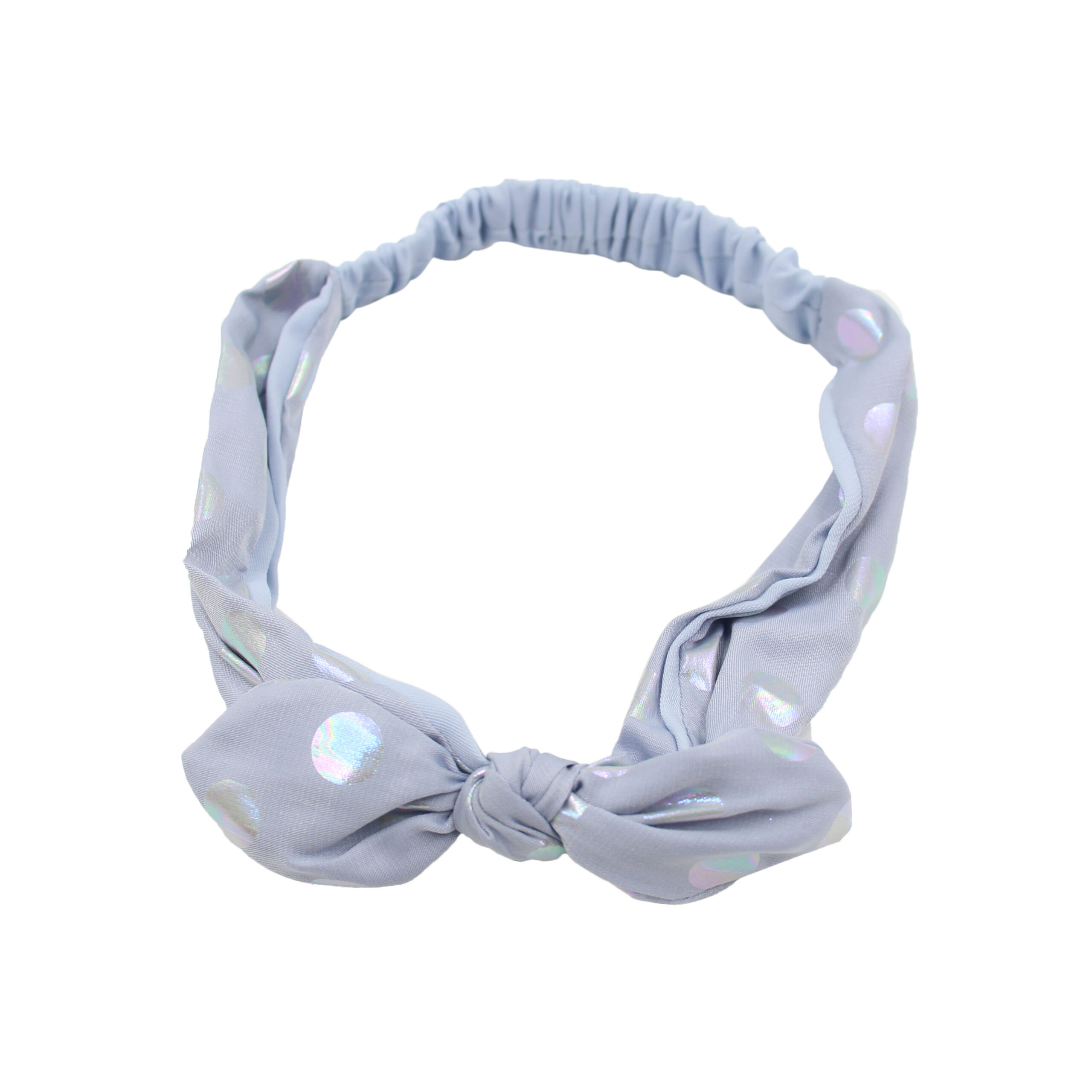 - Soft stretchy fabric with iridescent polka dots – shimmering, playful, and gentle on hair
