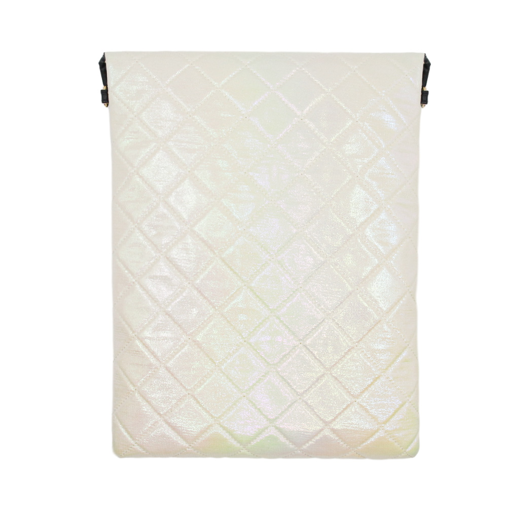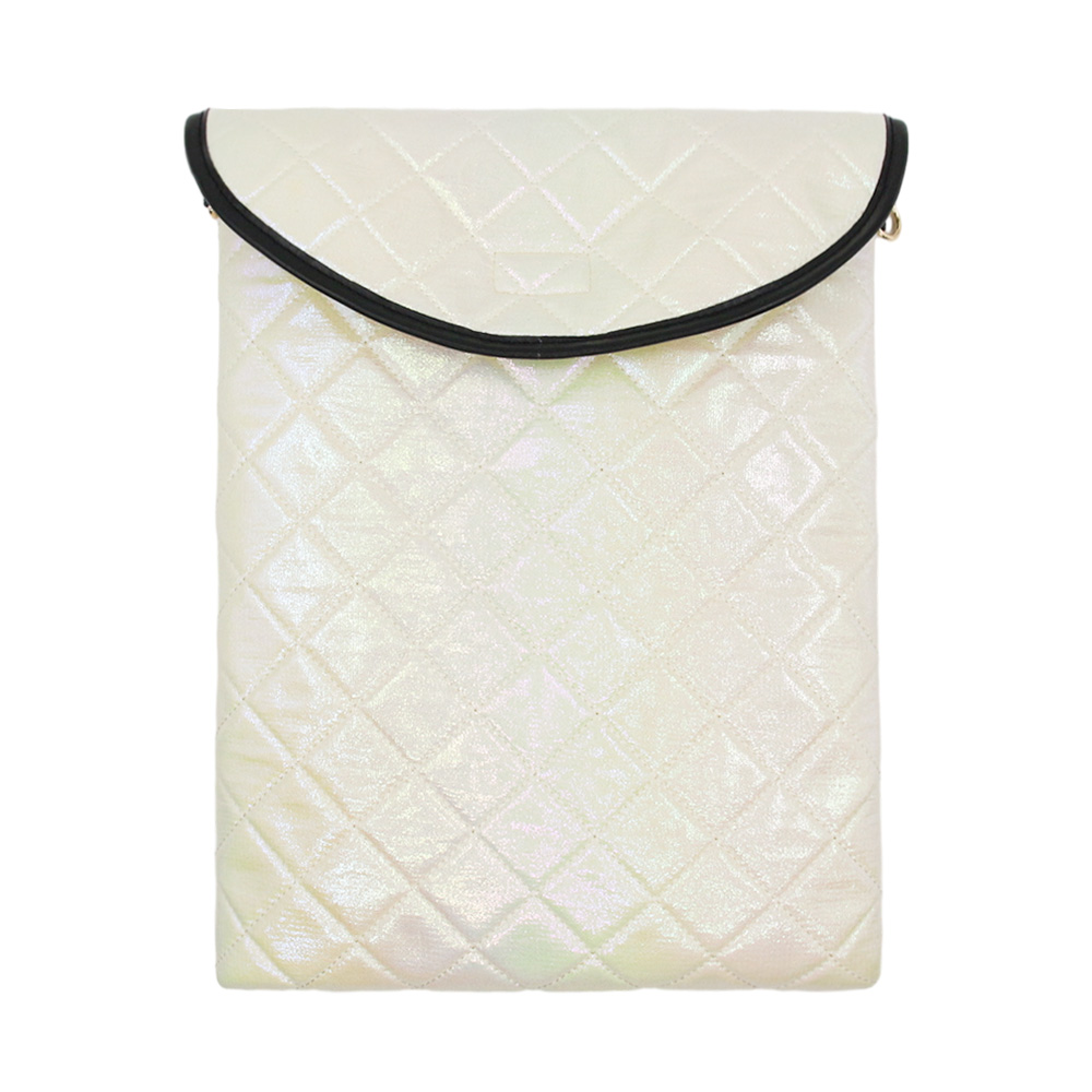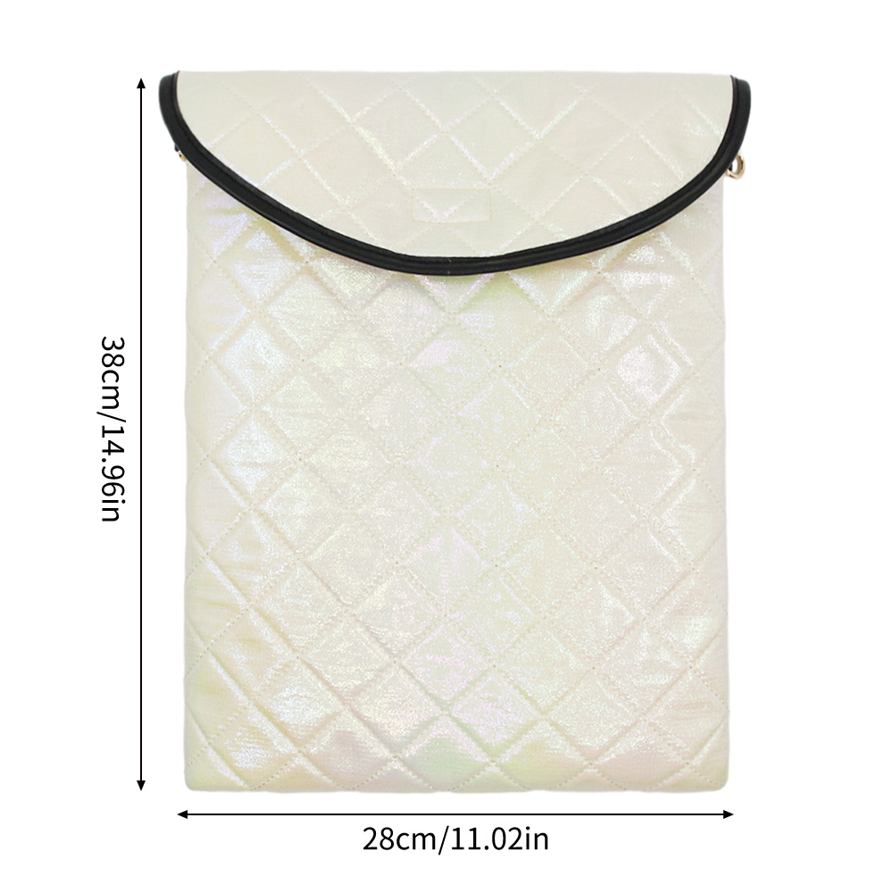 Designed with a glamorous, iridescent aesthetic, this envelope-style laptop sleeve offers a soft, protective silhouette with a head-turning finish. The padded, diamond-quilted structure cushions your device while keeping the bag lightweight—ideal for safeguarding laptops or tablets without adding bulk to your tote or backpack. The iridescent nylon surface shimmers with subtle color shifts, giving it a durable, easy-to-clean finish, while the envelope flap closure keeps your device secure on the go. Finished with sleek faux leather trim and metal eyelets, it adds a luxurious, versatile touch to an otherwise modern, structured design—perfect for commuting, travel, or everyday use.