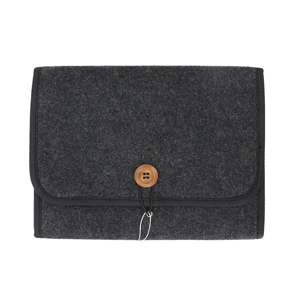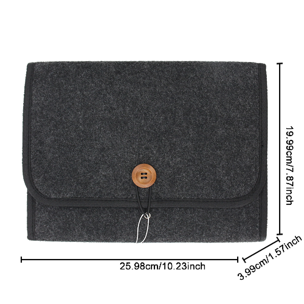 Designed with a rustic, organized aesthetic, this felt foldable jewelry organizer offers a compact, protective silhouette with exceptional storage capacity. The tri-fold design keeps necklaces, earrings, bracelets, and rings neatly separated and tangle-free while remaining portable—ideal for travel or daily use without taking up too much room in your tote or luggage. A durable felt surface gives it a soft, protective finish, while the wooden button closure keeps items secure on the go. Finished with clear PVC pockets, earring slots, and a hanging hook, it adds a practical, organized touch to an otherwise modern, functional design—perfect for travel, at-home storage, or everyday carry.
