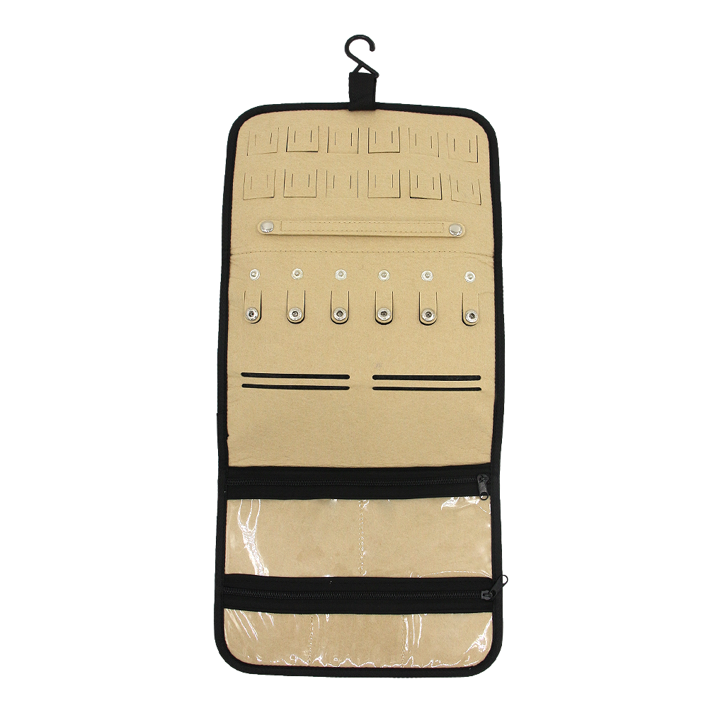 - Detail: Integrated earring holder panel, ring snaps, elastic straps, and transparent PVC pockets for easy organization