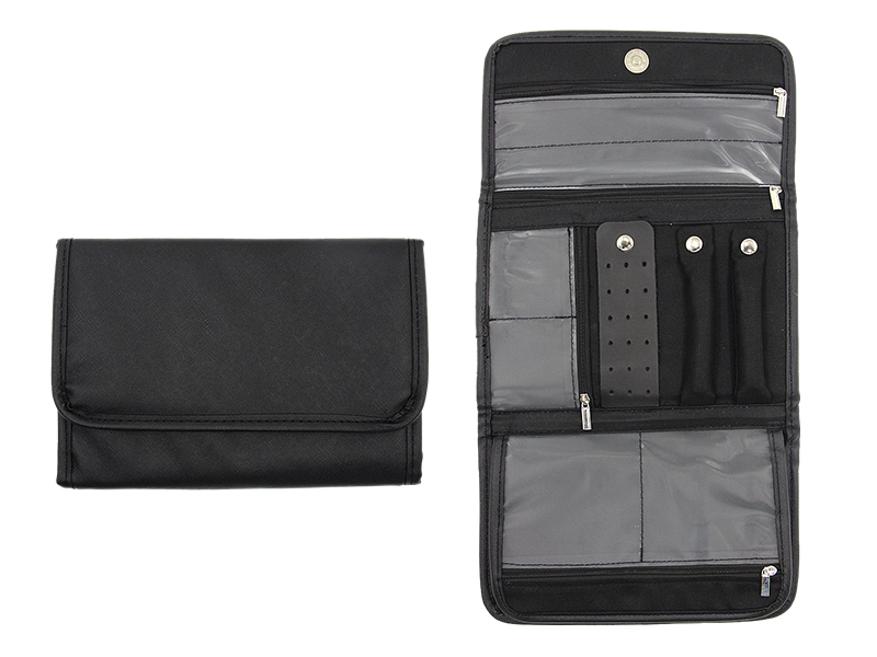 - Detail: Integrated earring holder panel, brush slots, and transparent PVC pockets for easy organization